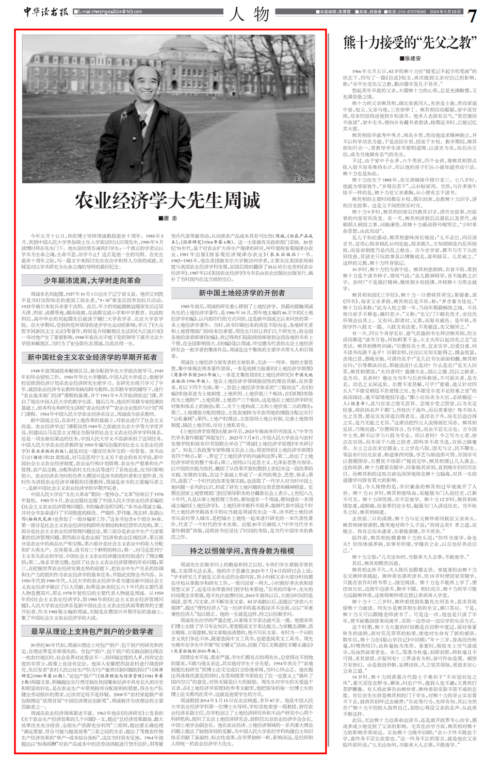 周诚教授2014年5月15日在北京病逝,享年87岁。他是中国人民大学农业经济学科第一位博士生导师,学校首批荣誉一级教授,曾任农业经济系副主任,在学校创立了土地经济研究所和不动产研究中心两个科研机构,组织了北京土地经济研究会,曾担任北京农业经济学会会长,中国土地学会副会长。他在农业经济、土地经济领域的一系列重大理论问题上提出了独到深刻的见解,为中国人民大学农经学科构建自主知识体系贡献了基础性、标志性成果,在学界独树一帜,影响深远,是经师和人师统一的农业经济学大先生。